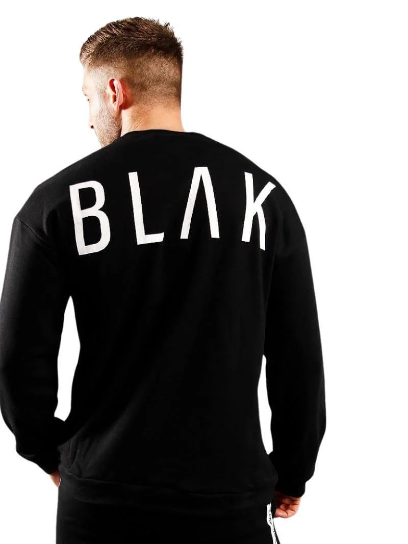 This BLAK White Logo Sweater is black with small print BLAK branding in white print across the chest and a large print on the back. The BLAK Apparel White Logo Oversized Sweater is an oversized, dropped shoulder and boxy style for a modern and comfortable fit. It also has a round neckline. This BLAK Apparel sweater is the ultimate oversized top offering maximum comfort.