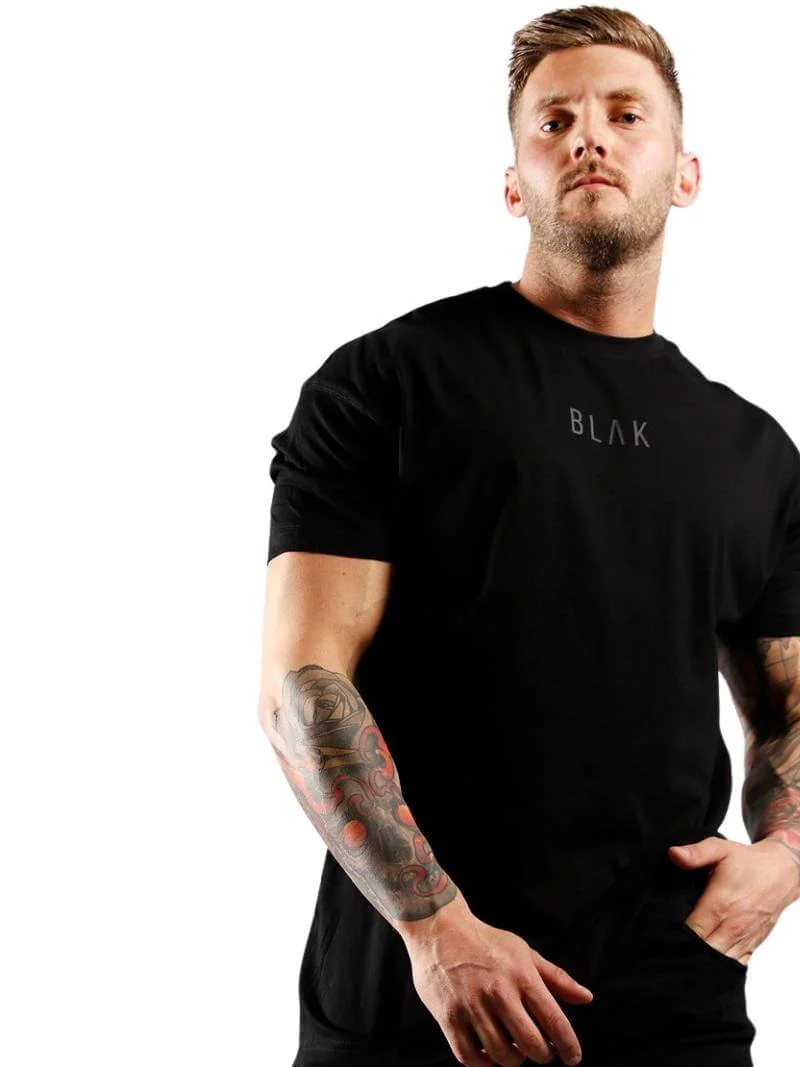This BLAK Apparel men's oversized t-shirt is black with a large print BLAK branding in white or black across the back. Furthermore, there is a small logo print across the chest. This BLAK Apparel t-shirt is an oversized, dropped shoulder, and boxy style for a modern and comfortable fit. It has a rounded neckline. The t-shirt is the ultimate oversized top offering maximum comfort.