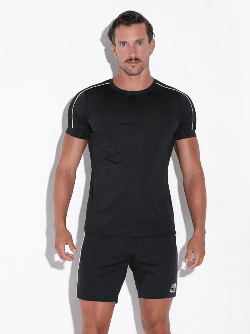The CODE22 Downtown T-Shirt is black with contrast off-white stripes across the shoulders and 3D breathable mesh shoulder panels.