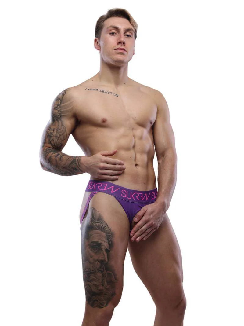 The Fantasy crotchless jockstrap is available in two colourways, shocking pink and tyrian purple with matching trims and a matching signature waistband. There is also SUKREW branding in white around the circumference of the waistband and straps.