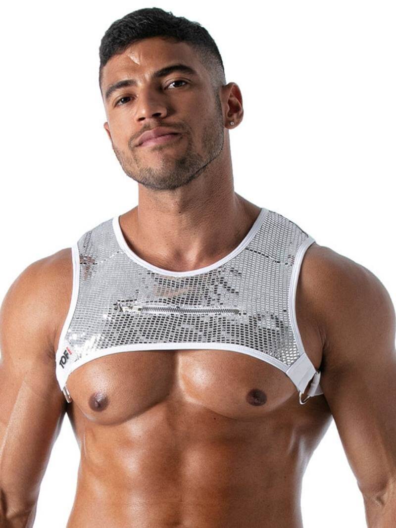 This TOF Paris Star Pocket Chest Harness will make you stand out on the dance floor! We're thinking retro disco! The harness is made with high-quality polyamide, which is covered with tiny glittery gold or silver rectangles. It is also finished with black or white trims and silver rings on the sides. Therefore, it gives a touch of fetish and masculinity. Additionally, there is TOF branding on a silicone label on the chest.